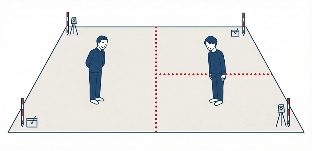 分割対象の土地が、更地であったり、更地にできる土地の場合は、隣接地すべての境界確定をおこなって、分筆することで物理的に分けることができます。物理的に分けることによって、それぞれの土地がそれぞれの単独所有となり、共有状態が解消されます。